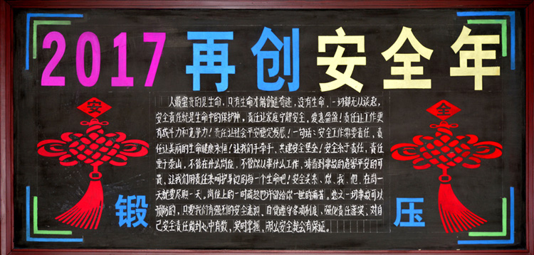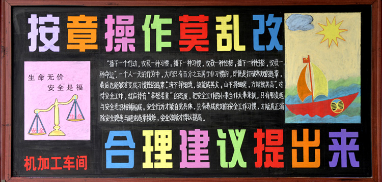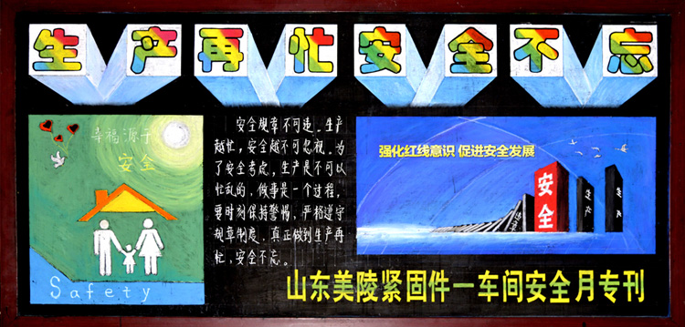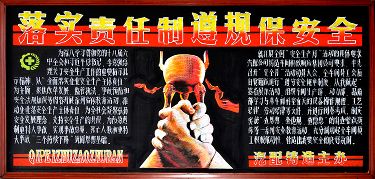 公司開展安全月活動(dòng)以來,各分公司以及車間積極相應(yīng),認(rèn)真落實(shí)安全月實(shí)施意見并且創(chuàng)作了黑板報(bào)對(duì)安全進(jìn)行宣傳,以下是部分優(yōu)秀作品