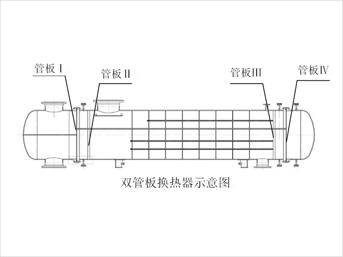 雙管板換熱器是在換熱器一端設有一定間隙的兩塊管板或相當于有一定間隙的兩塊管板的換熱器。雙管板換熱器是采用固定管板結構,管束不能抽出清洗,這是與單管板換熱器管束可以抽出清洗不同的地方。在換熱管端部有一塊管板,稱為外側管板,與換熱管及管箱法蘭連接。在距換熱管端部較近的位置還有一塊管板,稱為內側管板。外側管板與內側管板之間組成一個不承受壓力的隔離腔。